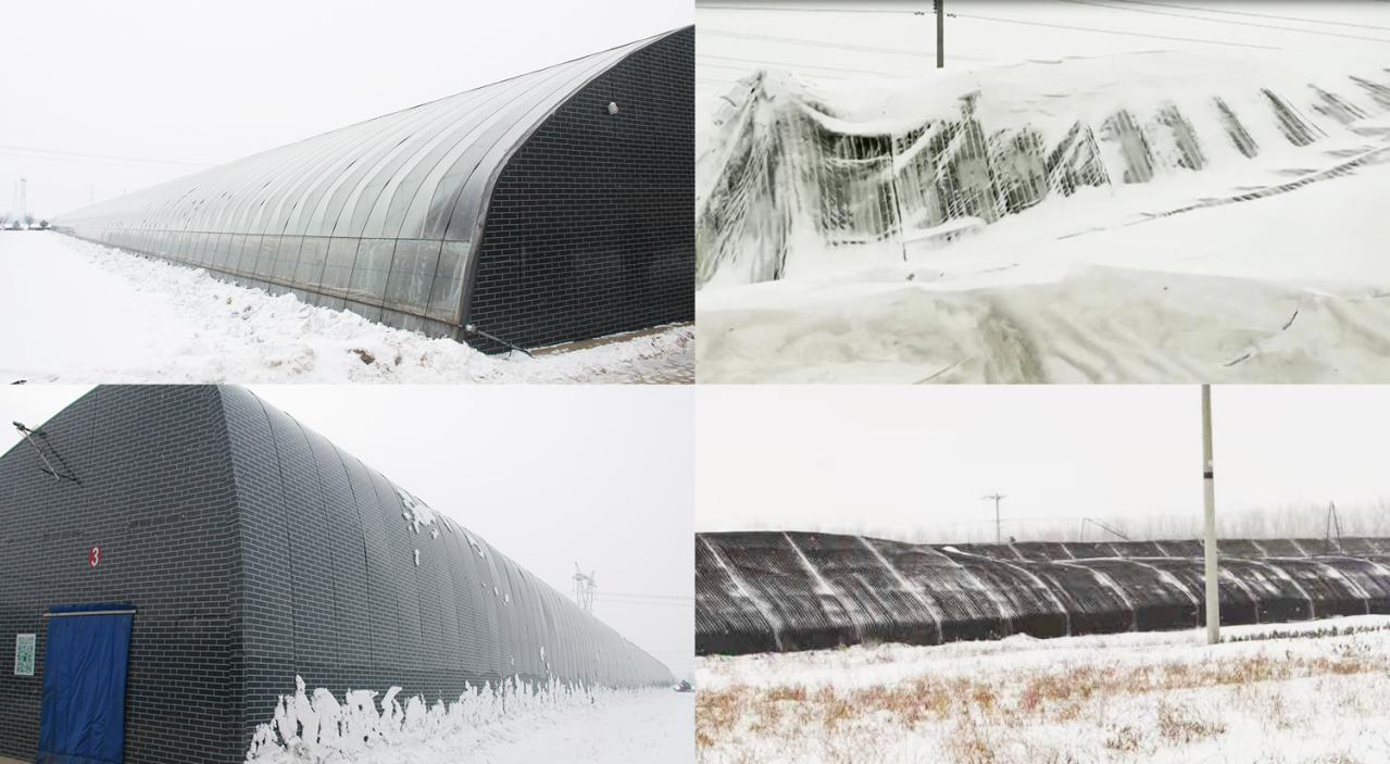 在寒冷的冬季里,若遇到突如襲來的降雪或狂風,北方高寒地區(qū)設(shè)施農(nóng)業(yè)生產(chǎn)將會受到嚴重影響,北方多數(shù)溫室因為積雪和狂風導致坍塌,而這時水蓄熱內(nèi)保溫裝配式日光溫室表現(xiàn)出強勁的使用性能。圖一為水蓄熱內(nèi)保溫裝配式日光溫室,內(nèi)保溫被正常卷起,落在溫室棚膜上的積雪自動滑落,不影響設(shè)施使用及作物生長。圖二為普通外保溫溫室,外保溫被積雪,不能卷起,設(shè)施承重增加,多半溫室被積雪壓塌,嚴重壓傷農(nóng)作物,同時溫室內(nèi)無光照,無法積溫及進行作物生長。