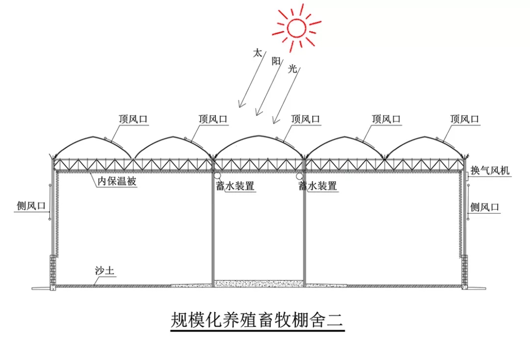 進行畜牧養殖的溫室稱為畜牧養殖溫室。配備智能控制系統的畜牧棚舍稱為智能保溫陽光畜牧棚舍棚舍內蒙古畜牧棚舍整體采用鋼架結構,輕便耐用;四周及頂部薄膜覆蓋;后墻及頂部后坡整體覆蓋毛氈型保溫被;頂部及四周設置通風口;棚舍內部在頂部及四周有保溫被;桁架上方設置接滴露薄膜及導流槽;內部設置一地下水池,供牛羊飲水。為節約投資可連棟使用。特別適用于大型畜牧養殖企業,單棟適用于大跨度不同禽類的單獨養殖。