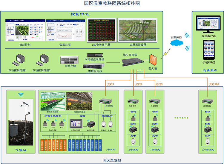 設施農業智能控制系統:通過農業物聯網系統,可以設定溫室內各種設備運行環境條件,當環境信息未達到預先制定的條件時,自動啟動溫室內的相關設備,比如:風機自動調節通風降溫、內外遮陽自動調節光照強度、自動噴滴灌、自動加濕除濕、自動施肥,實現智能化管理,節水,省電,省人工,更省心。